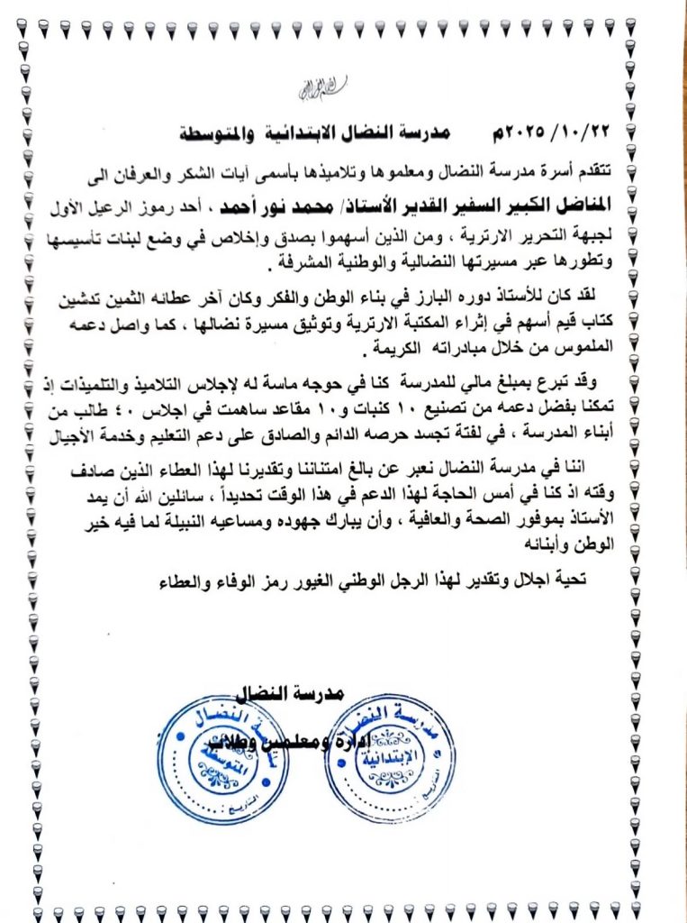 في لفتة تعبّر عن روح الوفاء والعرفان، قدّمت مدرسة النضال الابتدائية والمتوسطة -كسلا – خالص شكرها وتقديرها للسفير محمد نور أحمد، أحد رموز الجيل الأول لجبهة التحرير الإريترية، تقديرًا لمسيرته النضالية وجهوده المتواصلة في دعم التعليم وخدمة الأجيال.